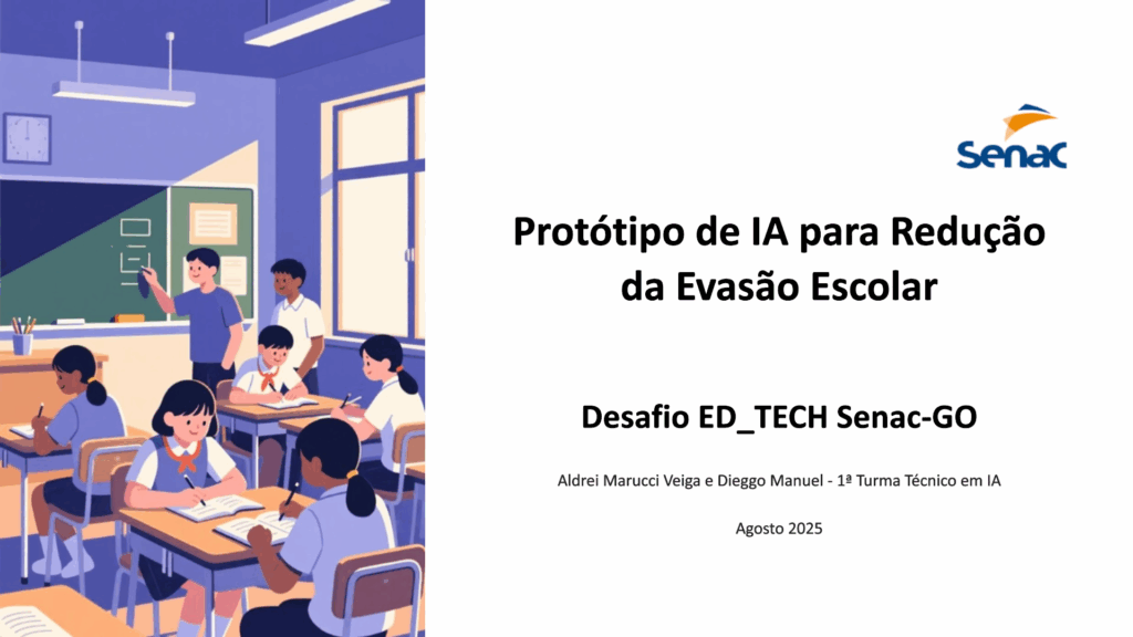 Alunos da primeira turma do curso Técnico em Inteligência Artificial do Senac Goiás apresentaram um projeto inovador que utiliza IA para acompanhar a jornada dos alunos e identificar riscos de evasão escolar. A iniciativa une dados educacionais e tecnologias de ponta para prever dificuldades e propor intervenções pedagógicas no momento certo, fortalecendo a permanência dos estudantes nos cursos.