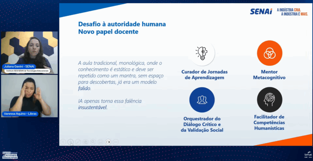 O Senac Brasil realizou a live “Como a Inteligência Artificial pode potencializar metodologias ativas e aproximar o ensino das práticas reais do mercado”, sétimo episódio da websérie IA na Educação Profissional. O encontro, mediado por Felipi Marques (Senac Departamento Nacional), reuniu Juliana Gavini (SENAI Nacional), Giselle Dutra (Jovens Gênios) e Priscilla Carla Silveira Menezes (Senac RN) para discutir como a IA pode fortalecer práticas pedagógicas centradas no estudante e conectar o aprendizado às demandas reais do mundo do trabalho.